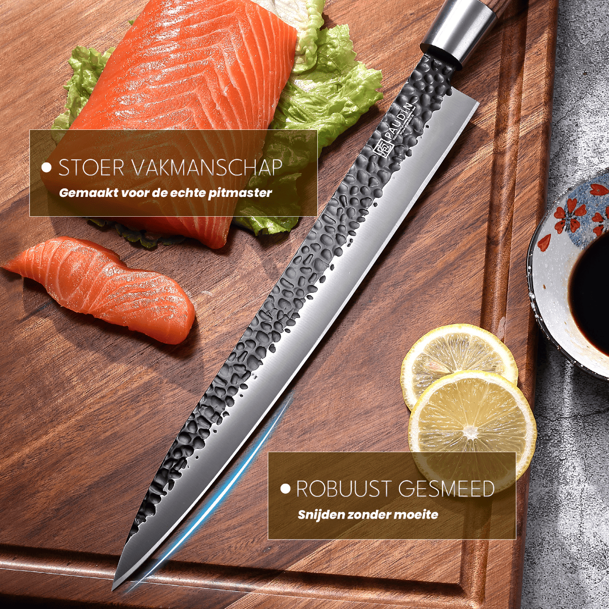 Ontdek de perfecte combinatie van precisie en kracht met het Paudin Hammer Black HB1 Sashimimes. Dit Japanse sushi- en vleesmes van 27,5 cm is ontworpen voor de serieuze thuiskok die waarde hecht aan kwaliteit en functionaliteit. Het gehamerde lemmet vermindert wrijving en voorkomt dat ingrediënten aan het mes blijven plakken.