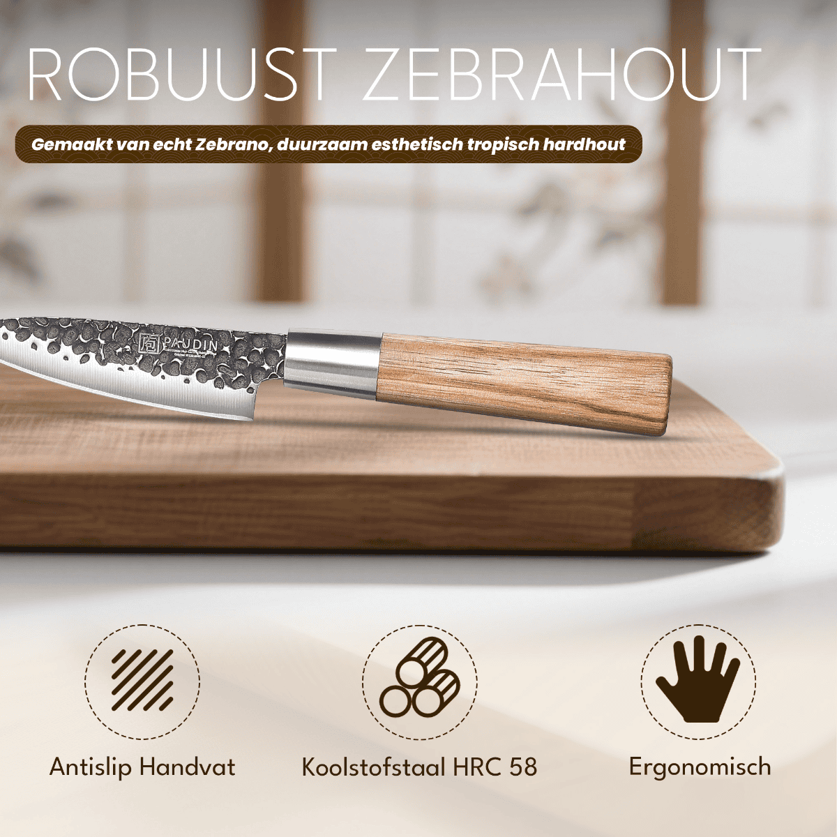 - Handvat materiaal: Zebrano hout (tropisch hardhout)